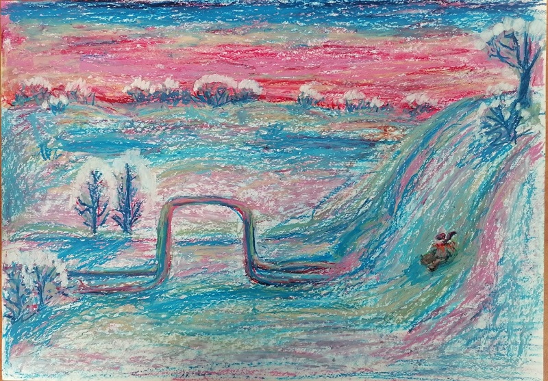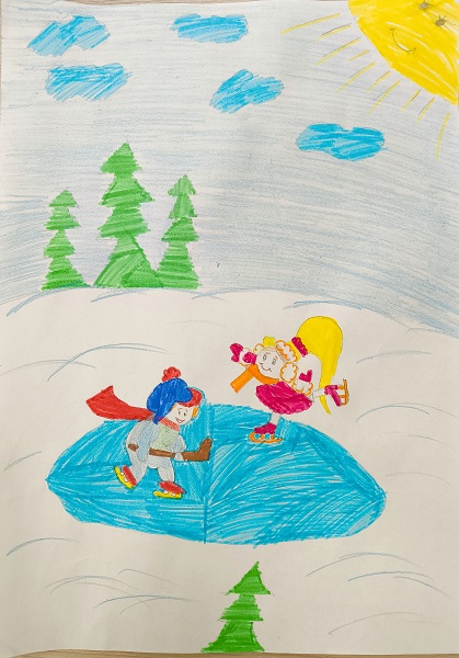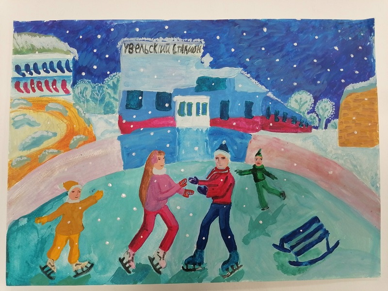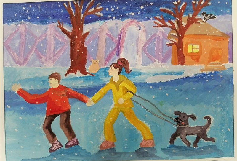 А вот воспитанники детской школы искусств им. Татьяны Матвеевой представили целую коллекцию работ в номинации «Зимние забавы» - пейзажные картинки отражают зимний досуг детей на свежем воздухе. Тут тебе и на санях покататься, с ледяной горки у двора спуститься, снеговика слепить, с четвероногими питомцами погулять, в снежной крепости осаду выдержать, в снежки поиграть. Или устроить настоящий танцевальный карнавал на льду!