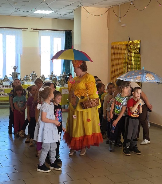 В уютном ДК детей встретила Хозяйка-Потешница. Она познакомила малышей с уникальной выставкой старинных самоваров, а затем начались игры, веселье и беседы о пословицах и поговорках, связанных с осенью и ее щедрыми дарами.
