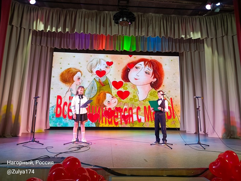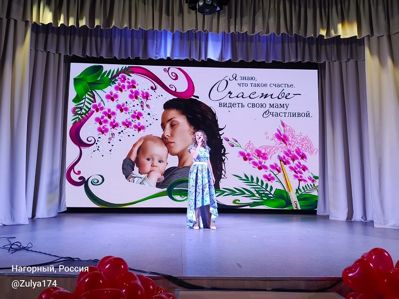 Недавно наша страна отпраздновала день матери. Не остались в стороне и нагорненцы. Для жителей поселка работники дома культуры «Кварц» подготовили и провели праздничную программу «Все начинается с мамы». Перед зрителями выступили юные артисты – вокальный коллектив «Гармония звука», руководитель Яна Климкина, и хореографический коллектив «Созвездие» под руководством Инны Тимофеевой. Также выступили взрослые вокалисты: Зульфия Черепанова, Яна Климкина, Ксения Безбородова, Александра Иванова и Гульнара Исламгалеева. Ребята поздравили своих мам не только прекрасными номерами художественной самодеятельности, но и постарались удивить их интересной видео-викториной, где мамы отвечали на вопросы ведущих, а дети записали свои ответы на видео. Таким образом семьи смогли узнать, насколько хорошо они знают друг друга. Кроме того ведущие Тимур Исламгалеев и Виктория Корепанова предложили семейным командам поучаствовать в конкурсах «Рисунок вслепую», «Бравый едок», «Угадай мелодию». Особенно порадовали зрителей самые маленькие участники праздничной программы – воспитанники детского сада. Они показали два номера – танец «Мамины ангелы» и «Подарок для бабушки» в исполнении средней группы «Пчелки», где дети не только лихо танцевали, но и браво играли на ложках. Финалом мероприятия стала акция «Битва любящих сердец», где все ребята подарили своим мамам шары в виде сердец со словами любви к ним.
